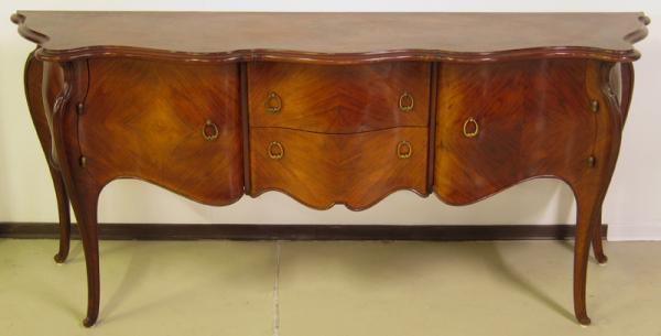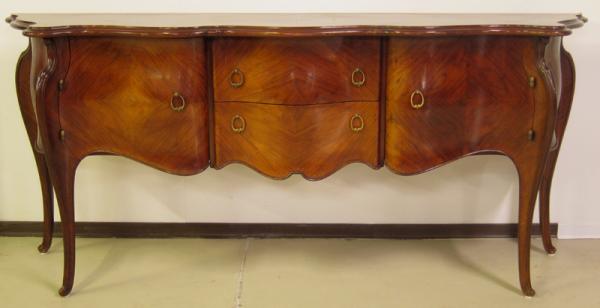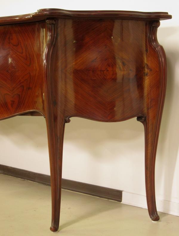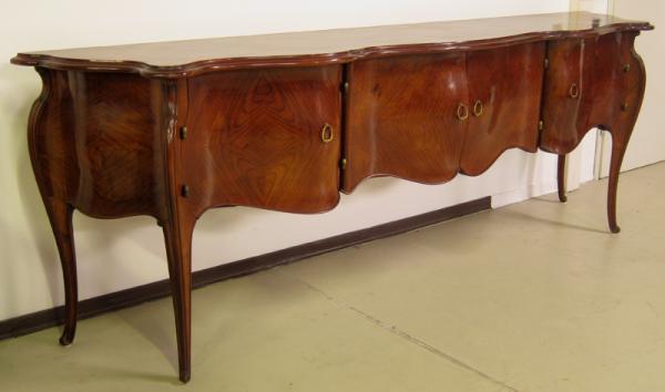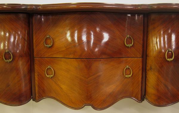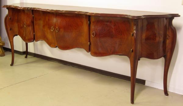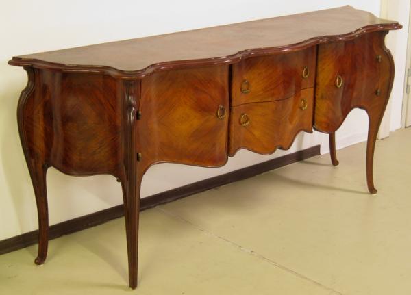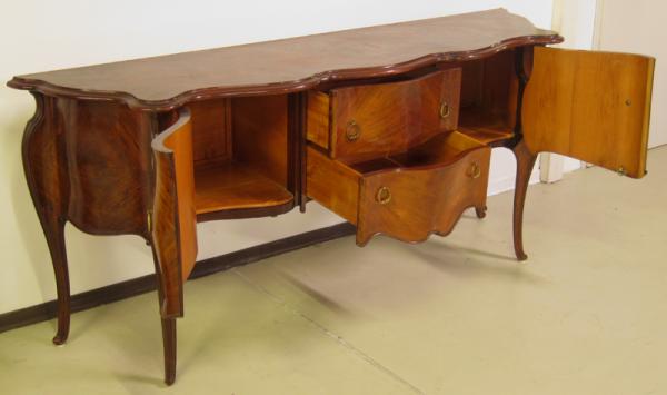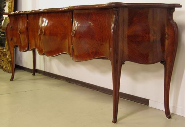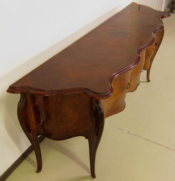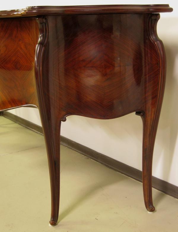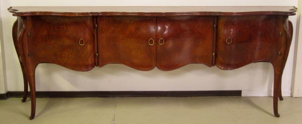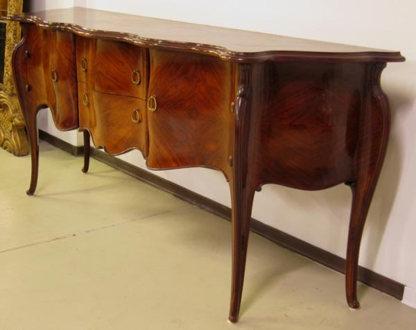 Hier dürfen wir Ihnen ein wunderschönes, elegantes Speiszimmer bestehend aus zwei seltenen schmalen Sideboards, dem passenden Tisch und sechs Stühlen, vorstellen. Dieses unvergleichliche Ensemble des prachtvollem Neobarocks fasziniert durch seine meisterliche Formgebung und kunstvolle Linienführung. Die Besonderheiten des Zimmers lassen sich in aller Kürze mit folgenden Punkten beschreiben: