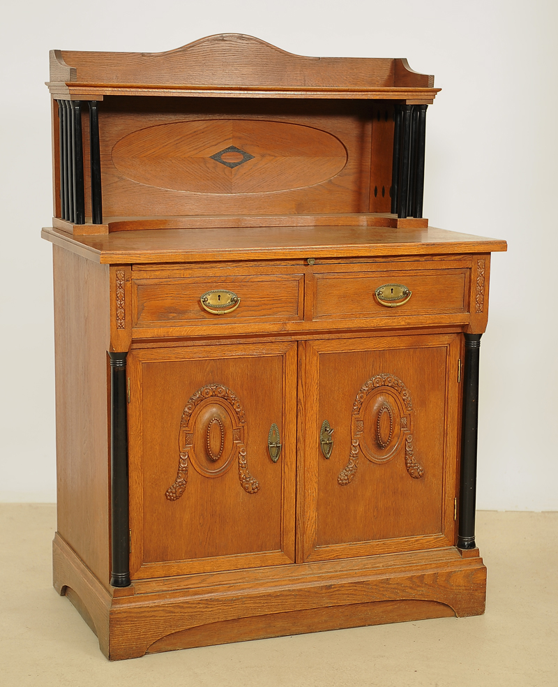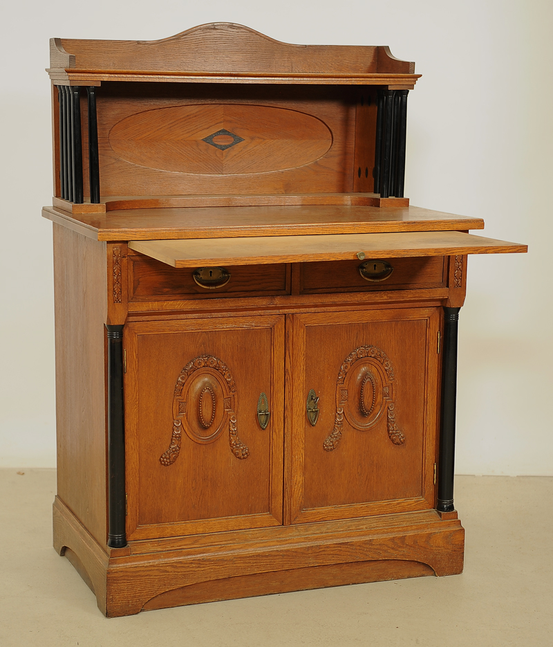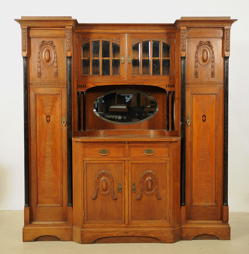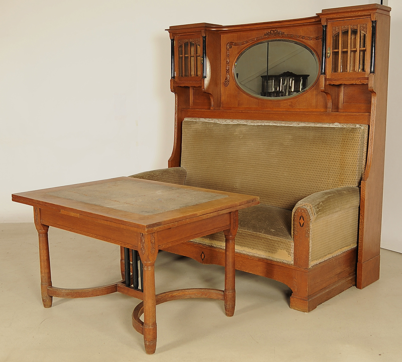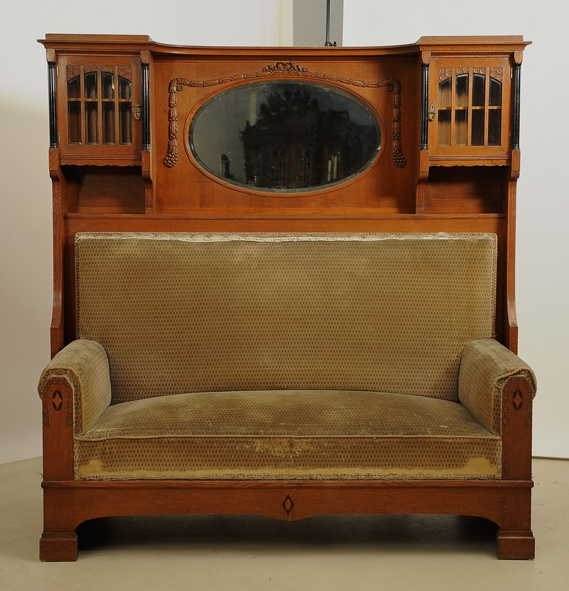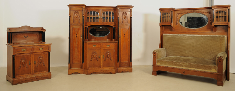 Besonders erwähnenswert sind unter anderem die facettierten Scheiben und Spiegel des Buffets und des Sofaüberbaus, die floralen Schnitzereien, elegante ebonisierte Säulen, die kleinen Intarsienarbeiten, die schmalen und eleganten Originalbeschläge, das unvergleichliche Furnierbild sowie das liebevoll bedachte Innenleben.